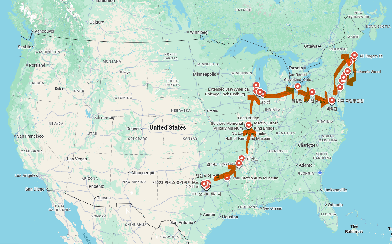 Incheon(인천) -> Texas(텍사스) : Dallas -> Arkansas(아칸소) : Little Rock -> Missouri(미주리) : Saint Louis -> Illinois(일리노이즈) : Chicago, Cleveland -> Inidiana(인디아나) -> Ohio(오하이오) : Cleveland -> Penssylvania(펜실베이나) : Pittsburg -> Meryland(메릴랜드), Verginia(버지니아) : Washington D.C. , Boltimore -> New Jersey(뉴저지) : Philadelphia -> New York(뉴욕) -> Conneticut(코네티컷) : New Heaven -> Messachusetts(메사츄세츠) : Boston -> New York(뉴욕) : New York City(Manhattan) -> Incheon(인천)