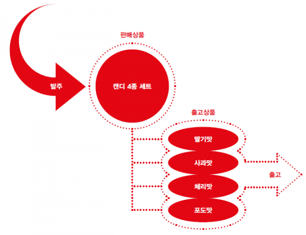 판매상품 단위와 낱개상품 단위의 물류관리가 모두 가능한 것은 그의 물류 시스템이 내거는 장점이다. 예를 들어서 이커머스 업체는 4개 맛 캔디 세트 상품을 판매할 수 있다. 이 상품은 소비자와 판매자 입장에서 보면 하나의 품목인데 실제로는 낱개상품 여러 개가 묶여서 출고 된다. 물류센터 입장에서는 네 개의 품목을 합포장 해야 하는 것이다. 이 경우 시스템이 출고작업자에게 ‘4개 맛 캔디 세트’를 픽업하라고 지시하면, 작업자가 혼란할 수 있다. 이 때 실제 상품명을 SKU 단위로 치환하여 전달해주는 작업이 시스템에선 필요하고, 그의 시스템은 해당 기능을 만들었다.